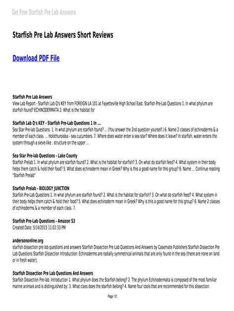 Download Starfish Pre Lab Worksheet Answers Doc